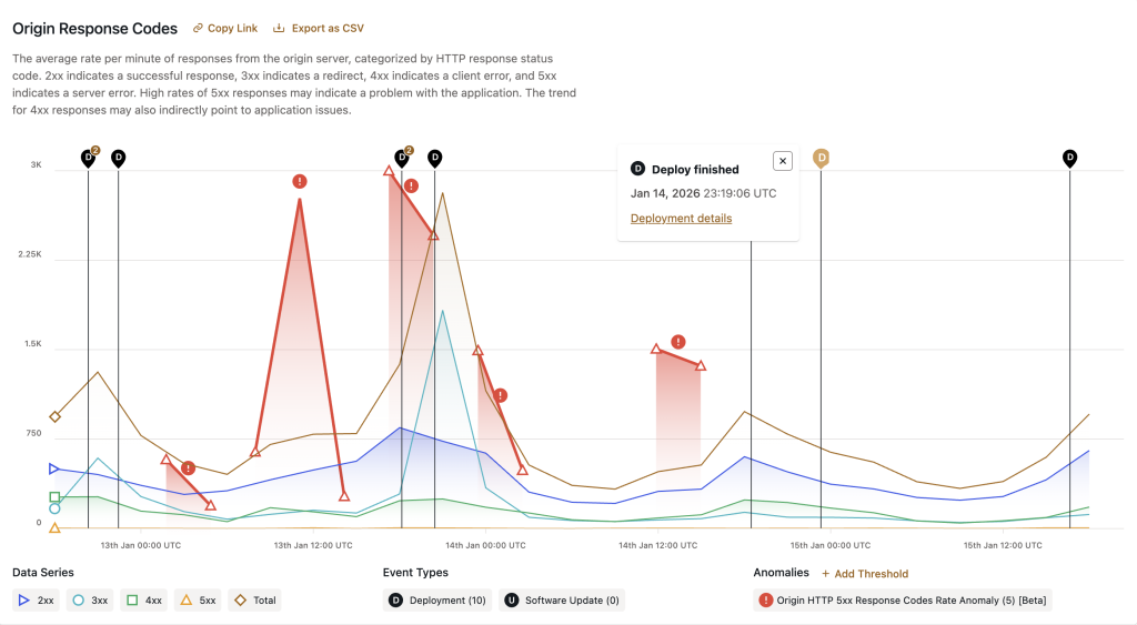The 5xx Response Codes Rate Anomaly Event Type indicates a significant increase in the number of an application’s 500–599 HTTP response codes, also referred to as “5xx“. 5xx responses indicate a server error on a PHP (WordPress) or Node.js origin server. Server errors are a strong indication that the application—or the server it is running on—is in an unhealthy state and requires investigation and intervention. Server errors can also cause end users to experience service disruptions.