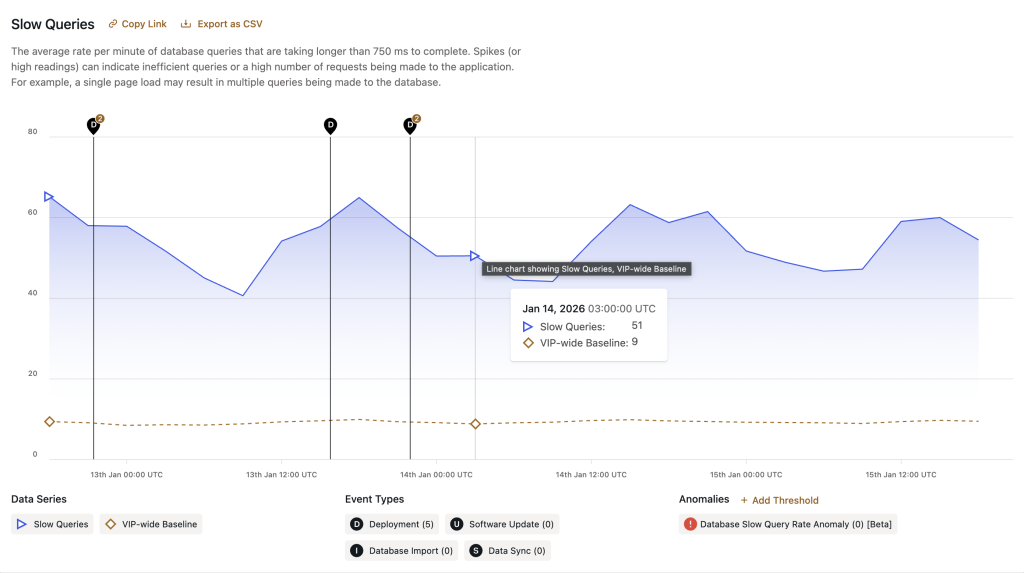 To begin, the timestamp of a recent Anomaly Event Type occurring in the “Slow Queries” section of the Insights & Metrics panel can be correlated with the timestamp of a slow query listed in the Slow Query Logs panel of an environment’s VIP Dashboard. Only the 100 most recent slow SQL queries can be found in the Slow Query Logs panel, so not all occurrences of Anomaly Event Types will have a correlating log entry.